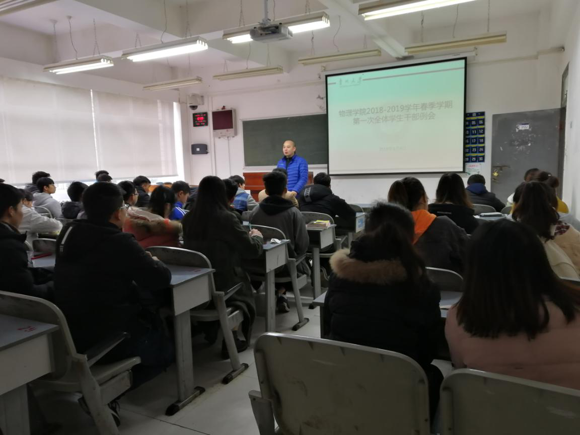 新学期伊始,开云链接官网(中国)有限公司-官网于2019年3月4日在博学楼312召开2019年春季新学期第一次全体学生干部例会。会议由院党委副书记陆定波主持,辅导员陈黔江、各班级班委、学生会全体干部参加了会议。