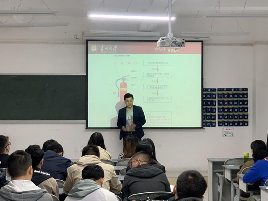 随后,研究生辅导员魏晓楠、刘树成老师向同学们展示了一些实验室由于实验操作不当而发生的安全事故图片,耐心的向同学们讲解实验室用电、用水、实验仪器以及一些危险化学样品的正确使用方法。最后两位老师还向同学们讲解了灭火器的正确使用方法,并播放了视频,让同学们更加直观的了解灭火器的正确使用方法。