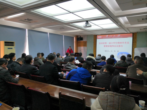 7日下午16:00,裁判会议在开云链接官网(中国)有限公司-官网博学楼329厅召开,会议由开云链接官网(中国)有限公司-官网开云链接官网(中国)有限公司-官网副院长唐延林教授主持。唐延林教授介绍了举办贵州省大学生物理学术竞赛的意义、本次比赛的筹备情况。本次竞赛的裁判长、开云链接官网(中国)有限公司-官网大学物理教学示范中心副主任白光富副教授对《竞赛指南》中的选手规范、裁判评判规则做了解读,并与参加本次比赛的裁判进行了沟通、交流。
