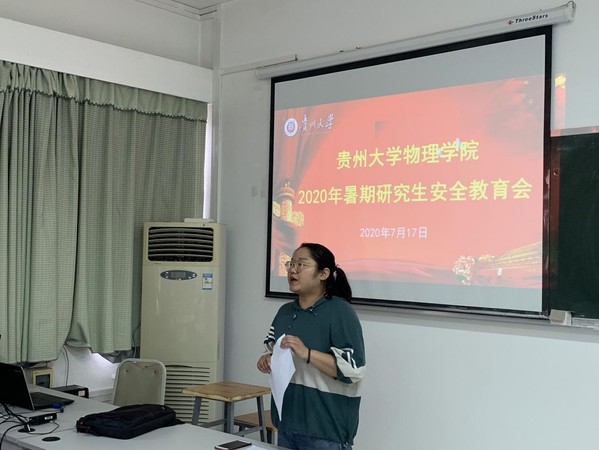 会上,魏晓楠老师传达了学校《关于做好疫情防控暨暑期研究生安全教育工作的通知》的文件精神,转达了学院领导对在校研究生安全的重视、生活和学习的关怀。魏老师首先详细介绍了关于暑期安全问题的具体内容。第一,返校研究生不再放暑假,研究生在校期间根据自己的实际情况合理安排学习和生活。第二,暑假期间学校对学生仍然进行封闭管理,如有看病或外出做实验的需要要进行请假,三天之内学院分管领导审批,三天以上学院主管领导审批。做到请销假登记。第三,强调研究生网络信息管理规范。第四,研究生要做好防火、防盗、防骗(网络诈骗、网络贷等)、防抢,注意用电、交通、饮食安全。切实做好卫生防疫工作。第五,暑假期间研究生在实验室工作要牢记实验室安全管理规定,按照规程操作实验。第六,严禁学生到无安全保障水域(如花溪河)游泳。