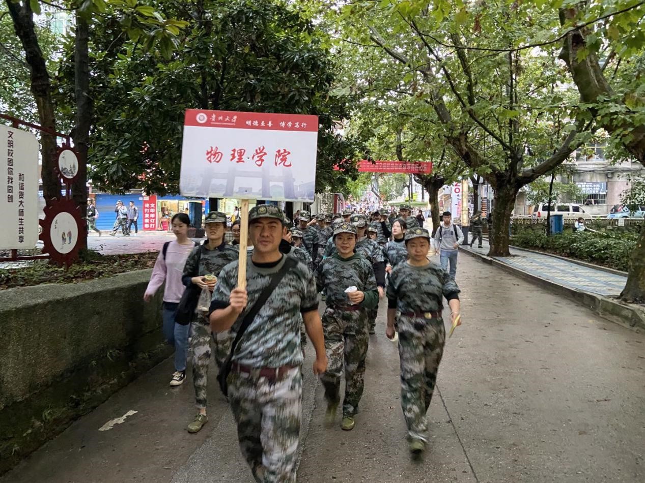 军训是酸的。每天早上的训练时间是从八点到十二点,下午和晚上是贵大精品课程的专属时间段。正襟危坐,不用一天的时间,脖子、肩膀、手腕、腿...都酸了。军训是苦的。经过了五天的训练,尽管学生们腰酸背痛,甚至“寸步难行”,但是这点训练对于贵大物院的学子来说又算得了什么呢?军训是甜的。溪山如黛,常沐春风,学府起黔中... ...贵大校歌的悠扬旋律,被贵大学子唱出了新高度!短短的军训,苦尽甘来,却让学子们深切感受到了求学的目的和读研的意义,做爱党爱国爱校的好学生,当伟大中华民族的硬脊梁!