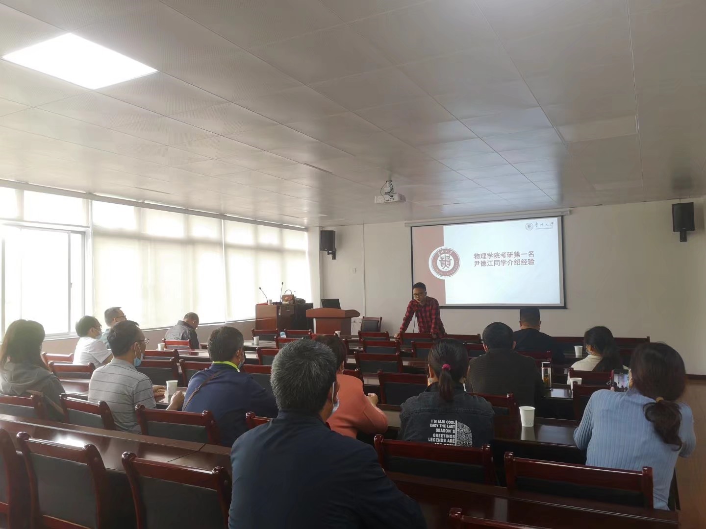 考研成功的学生代表尹德江就研究生备考向在座家长传授经验并分享“博学课”对考研的重要作用,他说,加入“博学计划”非常重要,只要在博学课上跟着老师走、边学边复习加强巩固知识,并且拿出认真的态度就能通过研究生升学考试。