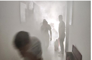 紧接着楼道迸发预设烟雾,学院老师立即启动应急预案,拉响警报,每个楼道口都有带着防护面罩的老师指明出口,其他老师和学生有秩序的用湿纸巾等捂住口鼻,低下头快速撤离火灾现场,最后大家在老操场会合,经老师清点后,所有同学老师都安全撤离。