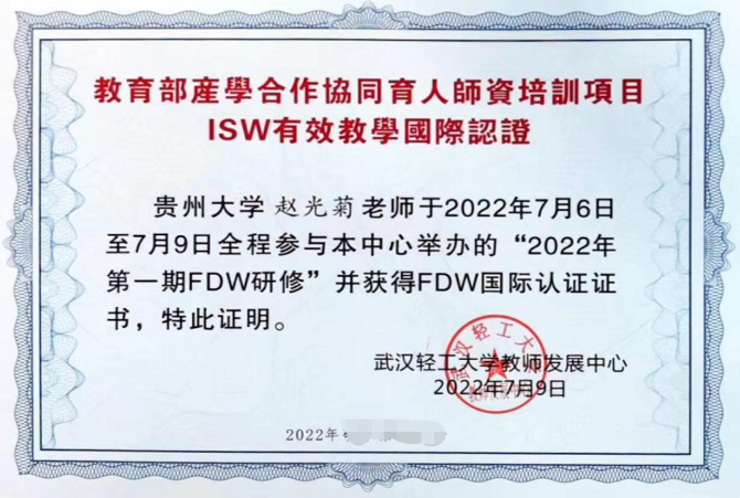 2022年7月6日至9日,教师工作处选派我院教学名师赵光菊参加武汉站“FDW教学技能引导员工作坊国际认证”培训,在2017年已获ISW国际认证第一级证书基础上,通过4天高强度的研习和演练,顺利晋级第二级国际认证,荣获“FDW教学技能引导员国际认证”证书,成为ISW工作坊教学技能引导员,可开展ISW教学工作坊、进行ISW学员国际认证培训及签发ISW国际认证证书。![]()