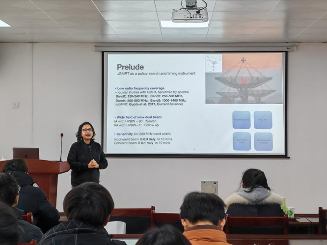 报告中,Bhaswati Bhattacharyya 教授分享了基于GMRT射电望远镜进行脉冲星搜索、计时、掩食和谱线等方面研究的开创性见解及其团队的研究成果。其讲解深入透彻、逻辑清晰,使学生们对这一前沿天文学研究有了深刻理解。
