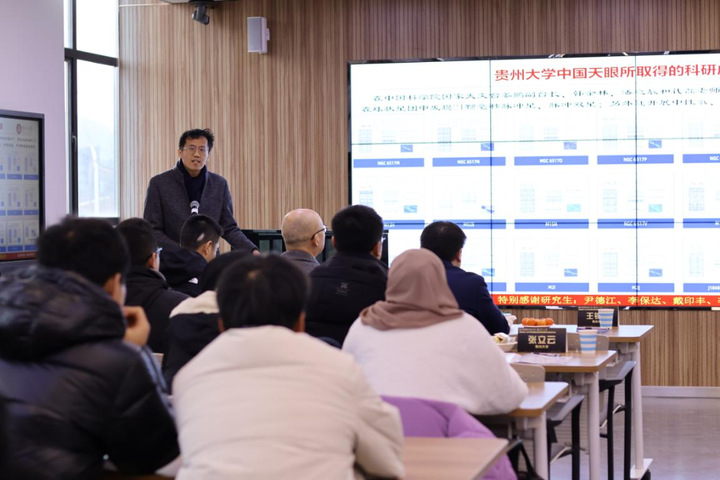 下午举办座谈会,副校长王旭出席并致辞。他诚挚欢迎中国科学技术大学天文专家团队的来访,表示学校将全力推动“组团式”帮扶项目确保双方合作取得实质性成果。对外合作处处长刘颖、贵州射电天文台办公室主任于东俊分别就“组团式”帮扶的具体情况和FAST运行情况及未来规划与专家团队进行深入交流。