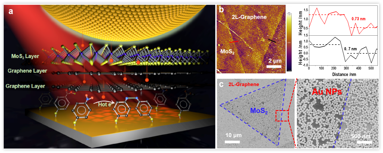 该研究通过构筑由两层石墨烯和单层MoS2构成的范德华异质结结构,将其置于120 nm金纳米粒子和光滑金膜构成的纳米间隙模式下。利用原位拉曼光谱和瞬态吸收光谱技术证明通过改变二维范德华异质结的堆叠顺序即可实现对等离激元产生热载流子进行调控,进而实现在亚纳米尺度下精确操控催化反应。这项工作为加深对二维范德华异质结调制热载子行为的理解提供了有价值的见解,并揭示了精确光催化剂设计的重要性。相关工作得到了中国自然科学基金(no. 22302045、no. 22465008)、开云链接官网(中国)有限公司-官网自然科学专项(特岗)科研基金(2023)31)的支持。