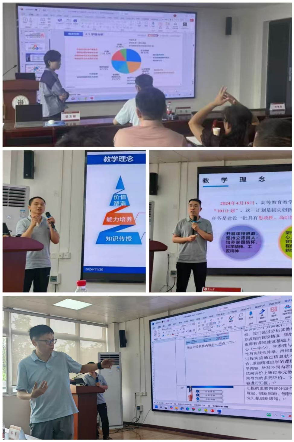 讲座结束后,许亮教授对令狐双艺、徐兆意、冯玉宇三位教师的说课展示逐一点评。他指出了说课过程中存在的逻辑结构、教学目标表述与技术应用环节中的具体问题,同时提出了切实可行的优化建议,帮助青年教师进一步提升课程设计与教学表达能力。