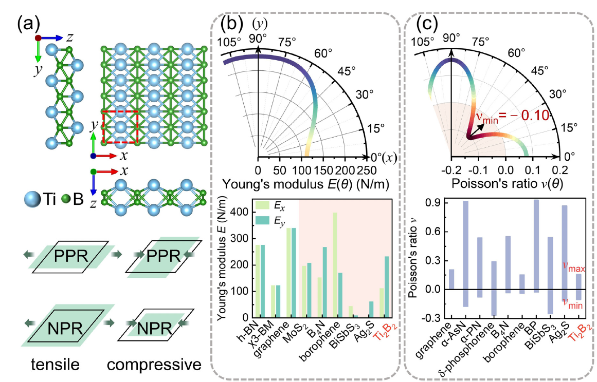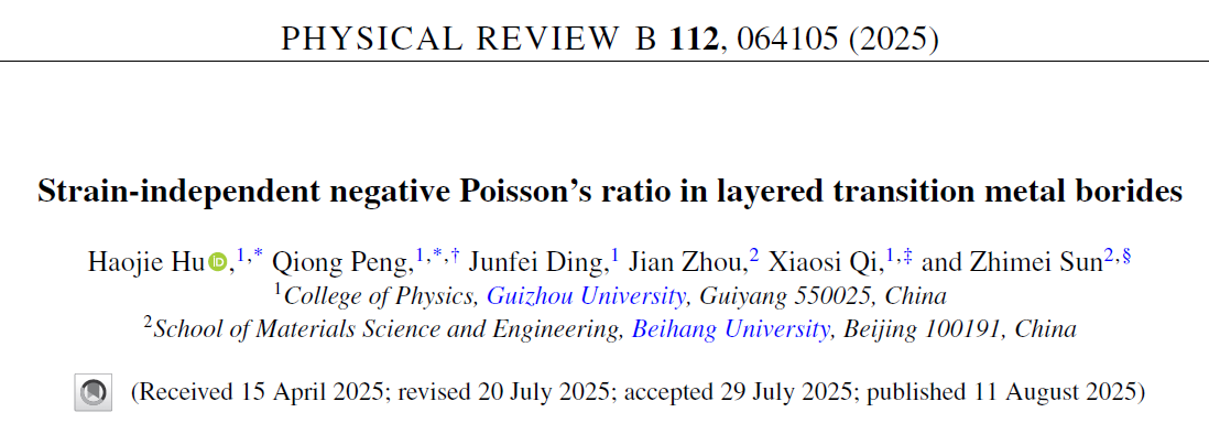 近日,我院彭琼副教授、丁俊飞博士、祁小四教授与北京航空航天大学孙志梅教授合作,在国际知名期刊Physical Review B上发表题为“Strain-independent negative Poisson’s ratio in layered transition metal borides”的研究文章,论文第一作者为开云链接官网(中国)有限公司-官网2023级硕士研究生胡豪杰。该研究基于密度泛函理论计算,发现了正交晶系的二维过渡金属硼化物Ti₂B₂ MBene中应变独立的负泊松比特性(45°方向ν = −0.10),且在0-30%大应变范围内稳定存在,性能超越黑磷(ν = −0.027)等传统材料。该负泊松比特性源于褶皱状B-Ti-B键角扩张与强p-d轨道杂化的协同作用。通过建立电子结构描述符,揭示了过渡金属电子特性调控负泊松比的新机制,Cu掺杂更将负泊松比提升至ν = −0.25。该研究成果揭示了正交晶系MBene中应变无关负泊松比的结构-电子协同调控机制,为设计机械自适应电子器件和抗循环变形锂空气电池电极提供了重要新思路。该研究工作的发表是该团队及我院物理学科在凝聚态物理领域的又一标志性突破。