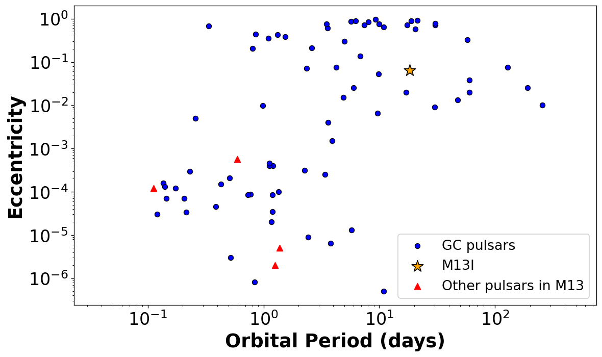 在M13已知的9颗脉冲星中,M13I 展现出独特的轨道特征:其轨道周期(18.23 天)和偏心率(0.06)均为该星团中最高值。这一现象与标准的脉冲星双星系统演化理论形成鲜明对比。对于双脉冲星来说,如果轨道开始时是非圆形的,由于潮汐力的作用,轨道的能量会转移到伴星,使得轨道最终圆形化。M13I 的高偏心率表明它偏离了这一演化路径。M13I 的伴星质量中值为0.54倍太阳质量,轨道投影半长轴为20.73光秒。较大的伴星质量和轨道投影半长轴可能是造成这一现象的原因之一,它们会导致轨道圆形化需要更长的时间。当伴星演化成白矮星时,轨道圆形化需要的时间可能超过宇宙年龄导致轨道偏心率“冻结”在某个值上而不是继续演化。