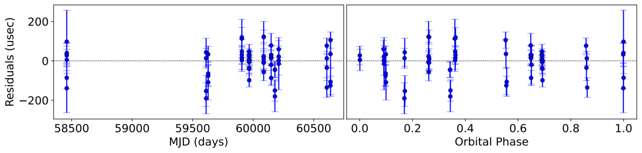 球状星团是由大量恒星高度聚集形成的古老恒星系统,其恒星整体密度极高,其中心区域的恒星密度可达太阳周围恒星密度的数万倍。由于在球状星团中已发现大量脉冲星,且其致密的恒星环境与演化特性利于脉冲星形成或留存,因此它也被学界称为“脉冲星工厂”。此前FAST的球状星团脉冲星巡天使用的搜索方法是基于快速傅里叶变换的频域搜索方法。该方法会将一部分能量分散到谐波中,同时对自转周期大于100毫秒的脉冲星存在灵敏度损失。快速折叠算法则是基于时域搜索方法,没有能量损失,理论上对任意周期性信号的灵敏度优于快速傅里叶变换。近两年来,团队采用快速折叠算法对 FAST 既往巡天数据开展了系统性重新搜索:一方面,对已知脉冲星的探测率高达 95%,验证了该算法的可靠性;另一方面,成功发现 1 颗新的毫秒脉冲双星(M13I,详见图 1)。此外,团队还利用 FAST 长达 6 年的持续观测数据,进一步获得了 M13I 的相位连接计时解(详见图 2),为后续研究其轨道特性与物理本质提供了关键数据支撑。