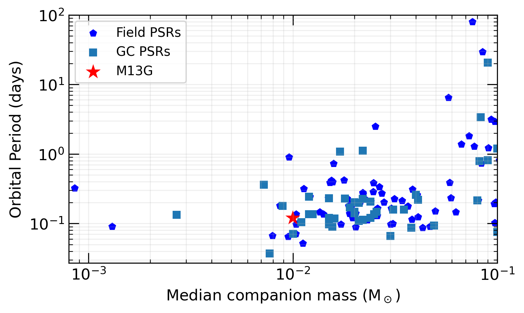 3. 脉冲星的中等伴星质量与轨道周期关系图及M13G在其中的位置