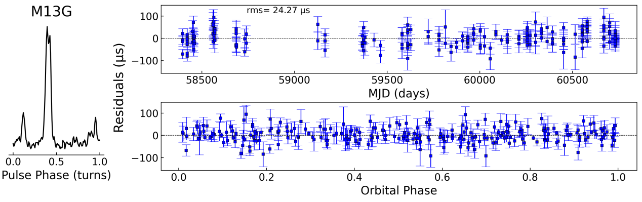 这两颗新发现的脉冲星都处于双星系统中。M13G的自转周期仅4.32毫秒,轨道周期约0.12天,伴星质量仅为太阳的百分之一,属于典型的“黑寡妇”类蜘蛛脉冲星系统,研究团队对其成功获得了其长达6.4年的高精度计时解(详见图1)。另一颗M13H自转周期约11.21毫秒,但由于信号极其微弱,仅在84次观测中被探测到两次,且呈现显著的轨道加速度,目前仍无法完整揭示其轨道特性。